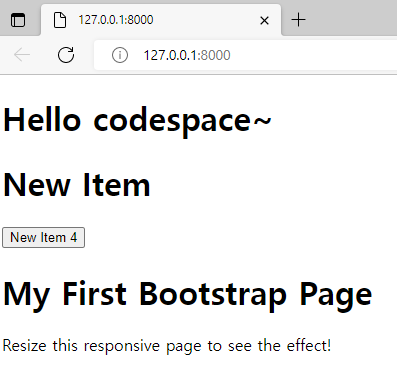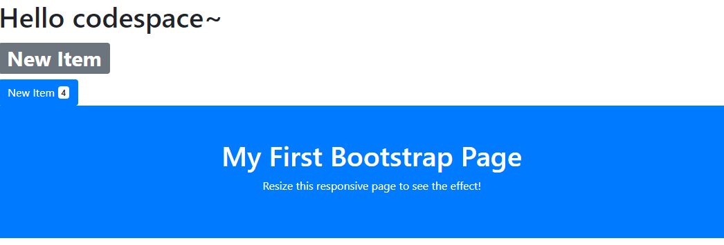 <!DOCTYPE html> <html lang="en"> <head> <link rel="stylesheet" href="https://cdn.jsdelivr.net/npm/bootstrap@4.6.0/dist/css/bootstrap.min.css" integrity="sha384-B0vP5xmATw1+K9KRQjQERJvTumQW0nPEzvF6L/Z6nronJ3oUOFUFpCjEUQouq2+l" crossorigin="anonymous"> <script src="https://cdn.jsdelivr.net/npm/@popperjs/core@2.9.2/dist/umd/popper.min.js" integrity="sha384-IQsoLXl5PILFhosVNubq5LC7Qb9DXgDA9i+tQ8Zj3iwWAwPtgFTxbJ8NT4GN1R8p" crossorigin="anonymous"></script> <script src="https://cdn.jsdelivr.net/npm/bootstrap@5.0.2/dist/js/bootstrap.min.js" integrity="sha384-cVKIPhGWiC2Al4u+LWgxfKTRIcfu0JTxR+EQDz/bgldoEyl4H0zUF0QKbrJ0EcQF" crossorigin="anonymous"></script> <meta name="viewport" content="width=device-width, initial-scale=1"> <h1> Hello codespace~ </h1> <h1><span class="badge badge-secondary">New Item</span></h1> <button type="button" class="btn btn-primary"> New Item <span class="badge badge-light">4</span> </button> <div class="container-fluid p-5 bg-primary text-white text-center"> <h1>My First Bootstrap Page</h1> <p>Resize this responsive page to see the effect!</p> </div> </head>