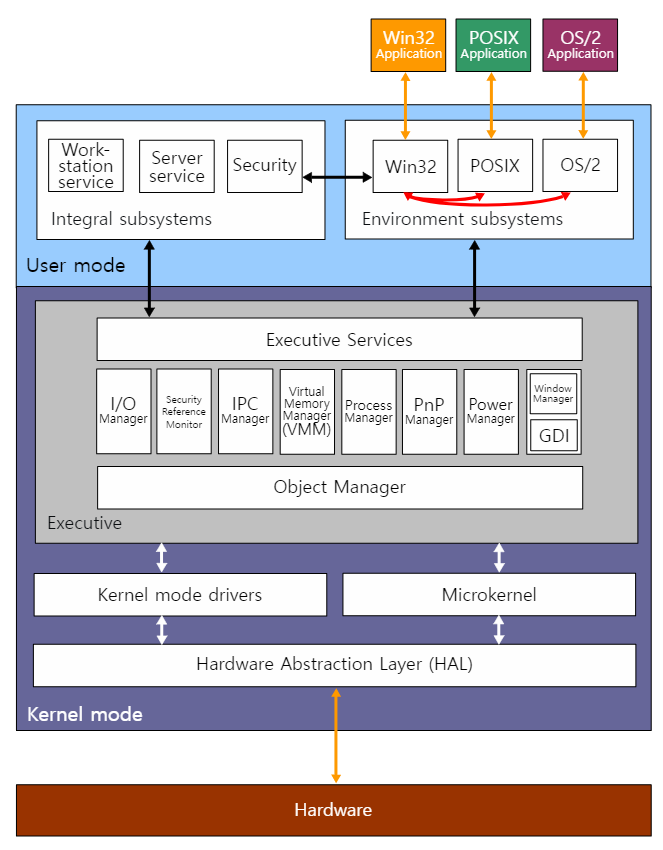 (하드웨어와 응용 프로그램이 바로 통신 가능)Security Reference Monitor 각 데이터나 시스템 자원 제어를 허가/거부, 시스템의 보안을 강제적으로 설정 IPC Manager 프로세스 사이에 데이터를 주고 받는 통신 VMM(Virtual Memory Manager) 응용 프로그램 요청에 따라 RAM 메모리 할당, 가상 메모리의 페이징 제어 Process Manager 스레드 생성 및 처리 커널 제어 :