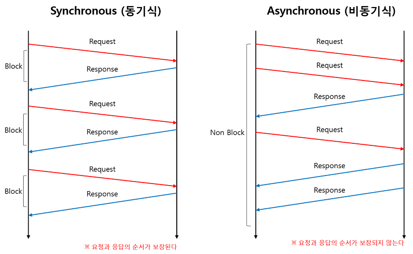 - 비동기 통신(Asynchronous)이란 request에 대한 response를 기다리지 않고 계속 request를 보내는 방식이다. 따라서 응답 순서는 요청 순서와 다를 수 있습니다.