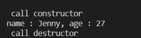 #include <string> //Person.h #include <memory> class Person{ private: std::string Pname = ""; int Page = 0; public: Person(const std::string &name, int age); //Person 클래스 생성자 선언 ~Person(); void ShowPersonInfo(); };#include <iostream> #include "Person.h" //Person.cpp Person::~Person(){ std::cout << " call destructor " << std::endl; } Person::Person(const std::string& name, int age){ Pname = name; Page = age; std:: cout << " call constructor " << std::endl; } void Person::ShowPersonInfo(){ std::cout << "name : "<<Pname << ", age : " << Page << std::endl; } int main(){ std::unique_ptr<Person> people = std::make_unique<Person>("Jenny", 27); people->ShowPersonInfo(); }