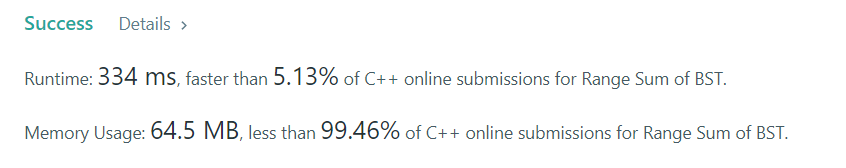 class Solution { public: int nSum = 0; int rangeSumBST(TreeNode* root, int low, int high) { if(root == NULL) return nSum; if(root->val >= low && root-> val <= high){ nSum += root->val; } rangeSumBST(root->left, low, high); rangeSumBST(root->right, low, high); return nSum; } };