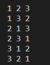 vector<int> v{2, 1, 3}; sort(b.begin(), b.end()); // {1, 2, 3} do{ cout << v[0] << " " << v[1] << " " << v[2] << endl; }while(next_permutation(v.begin(), b.end()));