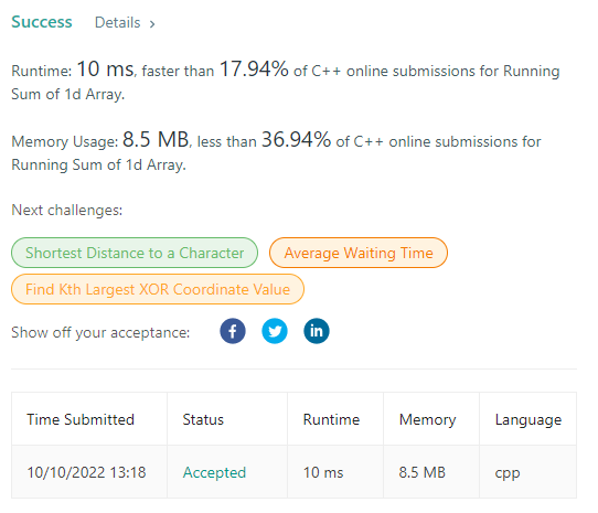 class Solution { public: vector<int> runningSum(vector<int>& nums) { int len = nums.size(); vector<int> answer(len, 0); answer[0] = nums[0]; for(int i = 1; i < len; i++){ answer[i] = answer[i - 1] + nums[i]; } return answer; } };