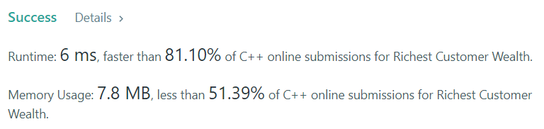 class Solution { public: int maximumWealth(vector<vector<int>>& accounts) { int result(0), sum(0); for(const auto& it : accounts){ sum = accumulate(it.begin(), it.end(), 0); result = max(result, sum); } return result; } };