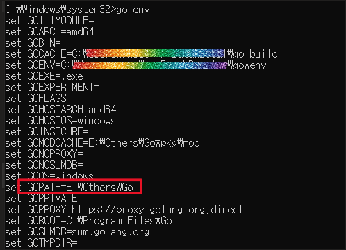 cmd 에 "go env" 명령어를 통해 GOPATH가 원하는 경로로 설정되었는지 확인합니다.
