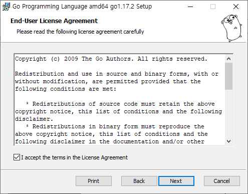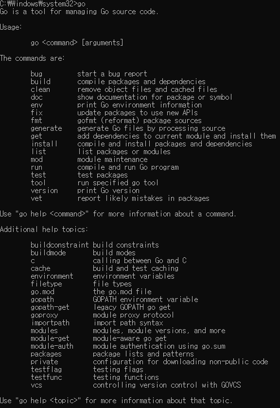 2. 명령 프롬프트에 "go"를 입력하여 설치가 잘되었는지 확인합니다.