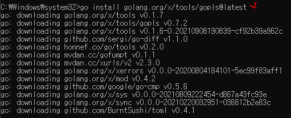 "go install golang.org/x/tools/gopls@latest" 명령어를 사용해서 실행 파일을 설치합니다.