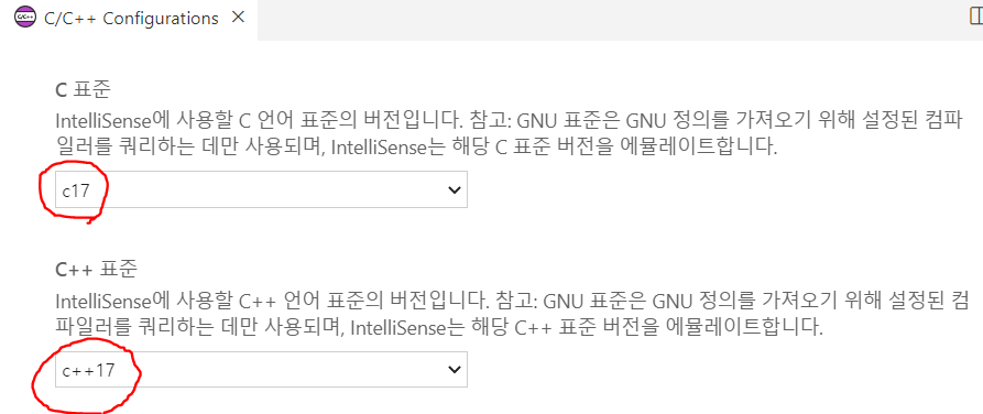 1. F1 > c/c++ configurations 에서 c17, c++17을 선택합니다.