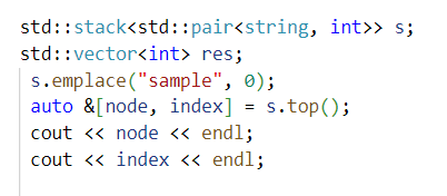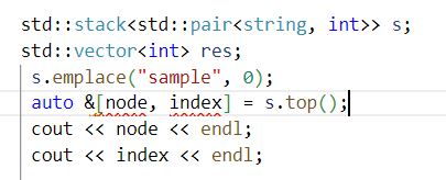 auto &[node, index] = s.top(); 대신 아래 문법을 사용해야 합니다. string node = s.top().first; int index = s.top().second;C++17로 변경하면 해당 문법이 빌드되는 것을 확인 할 수 있습니다.