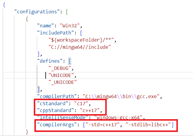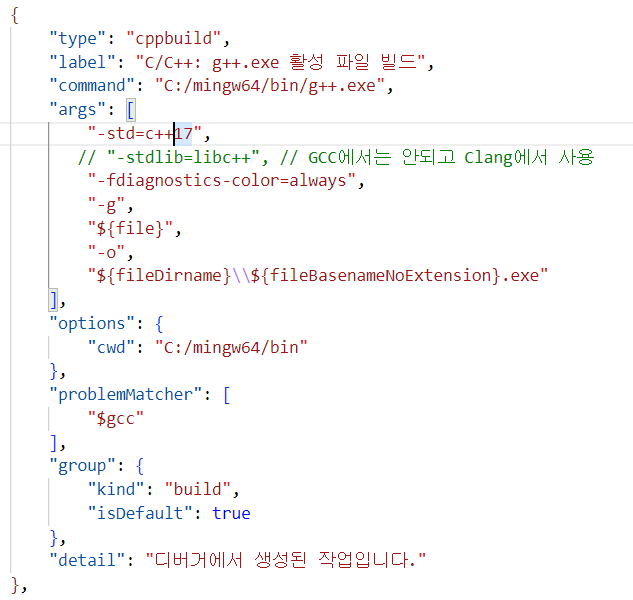 "cStandard": "c17", "cppStandard": "c++17", "compilerArgs": ["-std=c++17", "-stdlib=libc++"]3. tasks.json 파일도 수정합니다.