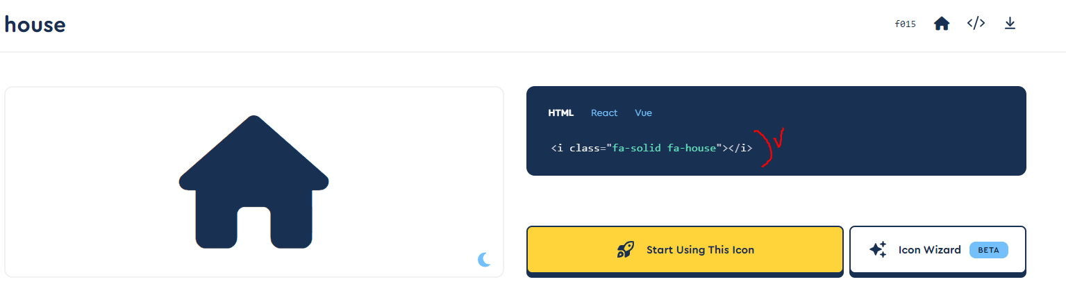 위 id를 복사해서 아래와 같이 icon 항목에 설정하면 house icon이 화면에 출력됩니다 :)