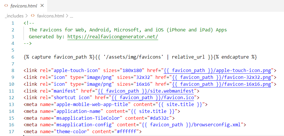 Chirpy 테마에서 favicons 설정은 "_includes/favicons.html "파일에 설정되어 있습니다.
