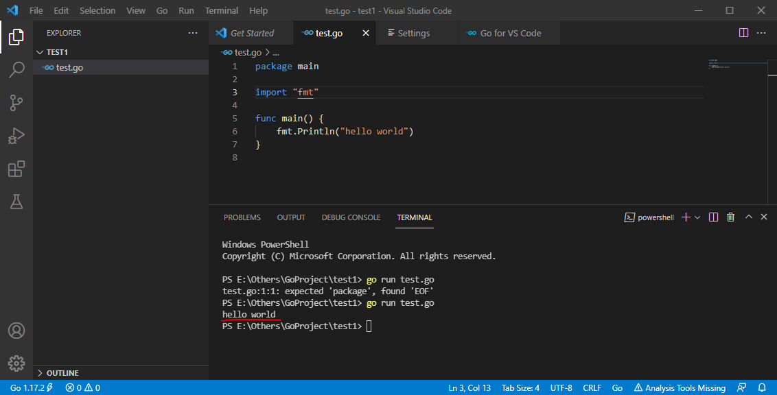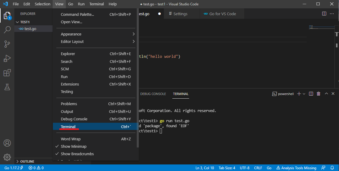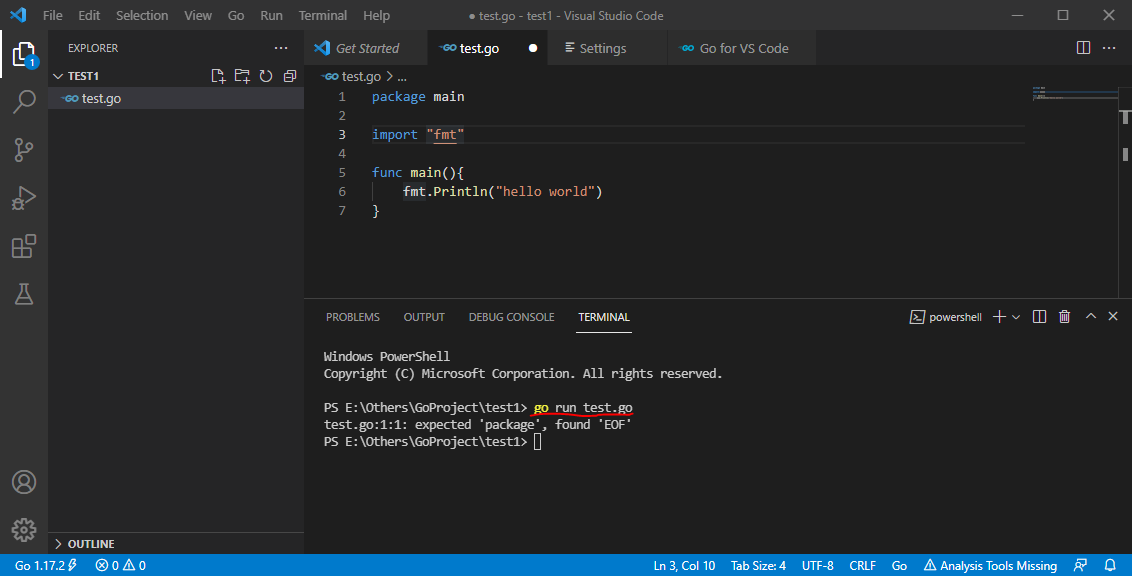 Terminal 창 생성 Terminal에 "go run test.go" 을 입력하면 hello world가 출력되야 하는데 expected 'package', found 'EOF' 라는 오류 메시지가 나왔습니다.