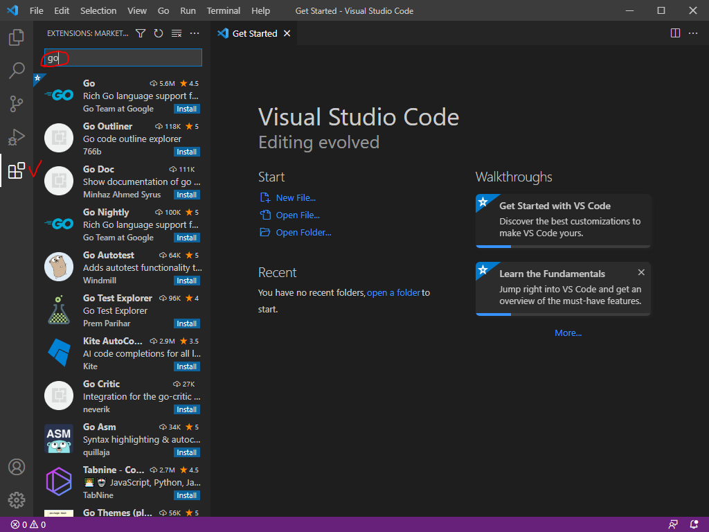 visual studio code go 검색 2. 검색창에 "go"를 치면 Go를 설치할 수 있는 install 버튼이 나옵니다. 눌러주세요~