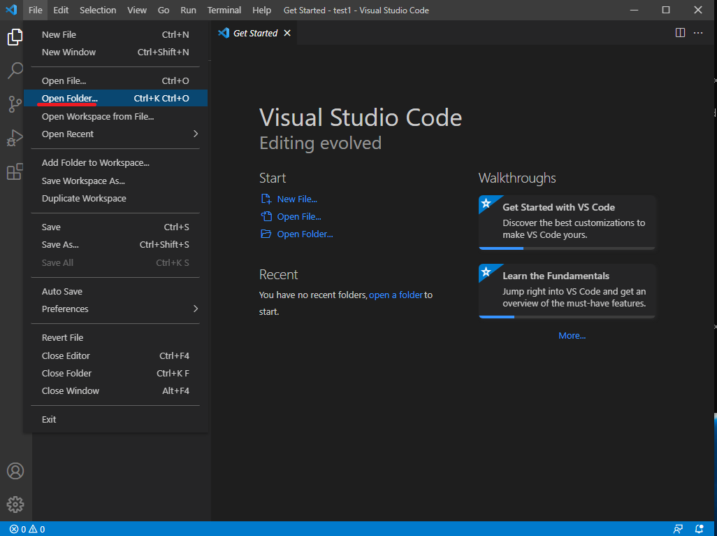 4. Visual Studio Code에서 Open Folder를 누르고 생성한 파일을 선택합니다.