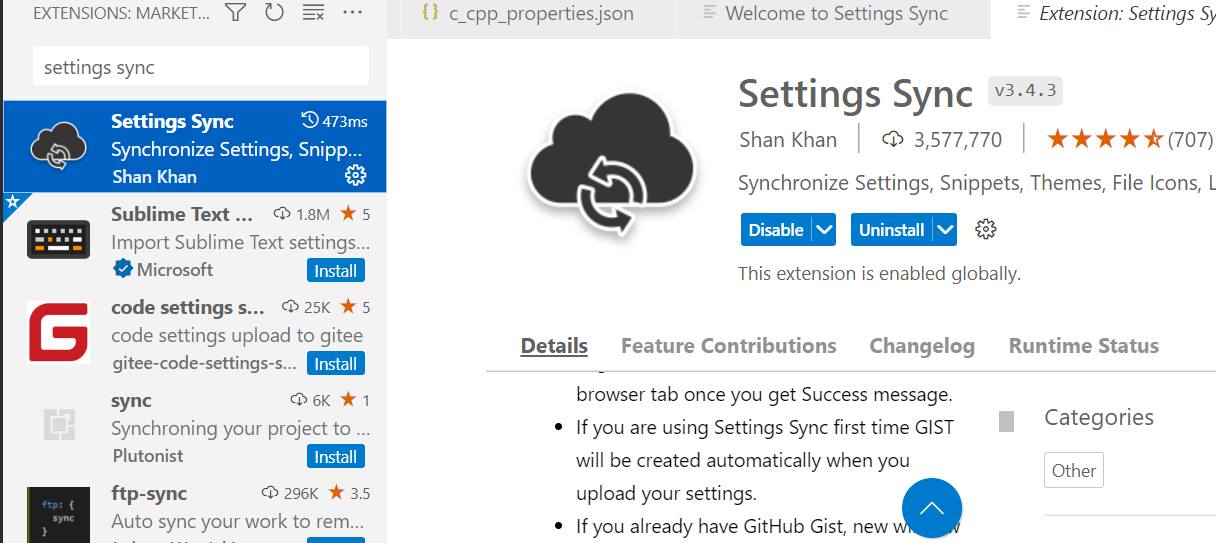 vscode extensions에서 settings sync를 검색하고 install을 클릭합니다.