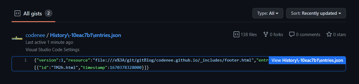 gist 목록에서 vscode settings 가 업로드된 것을 확인 할 수 있습니다.