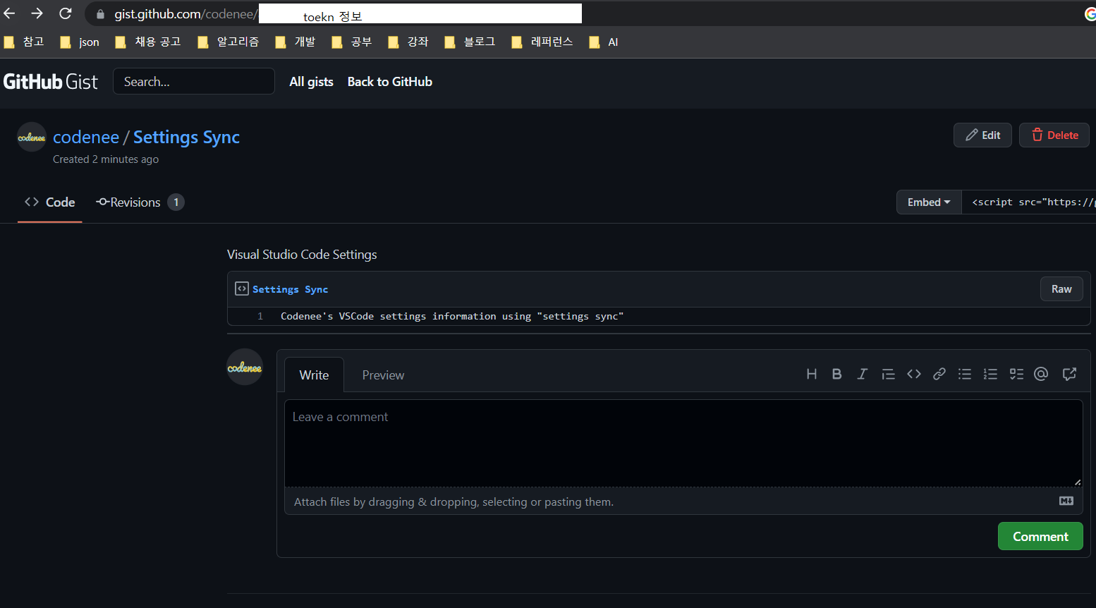 생성된 token정보는 url에 있습니다. token만 복사하여 VSCode의 Gist ID에 입력합니다.