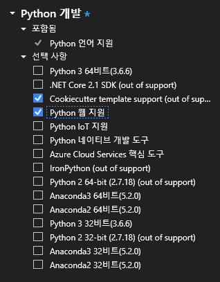 나중에 추가로 설치해도 되는 항목이라 저는 일단 python 환경만 설치했습니다.