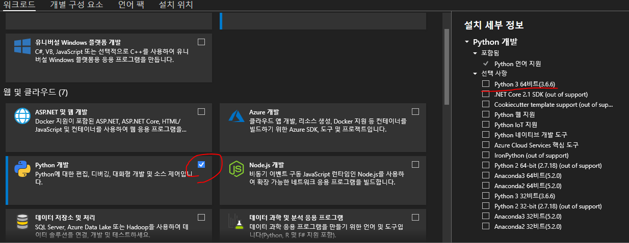 Python개발을 클릭하면 "설치 세부 정보" 항목이 나타납니다.