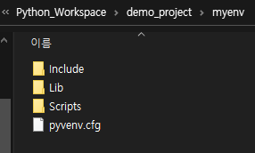 명령프롬프트에서 "dir"로 확인해도 되고, 생성한 경로에 가면 "myenv" 가 생성됨을 확인 할 수 있습니다.