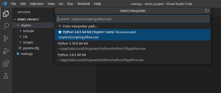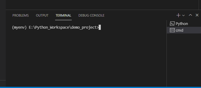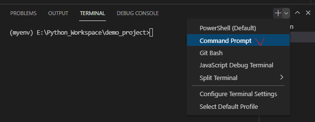 Terminal 에서 Command Prompt를 선택해서 보면 가상환경(myenv)가 실행되어