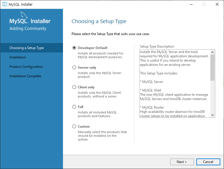 저는 개발에 필요한 항목을 설치하기 위해 개발자 모드인 Developer Default를 선택하겠습니다.
