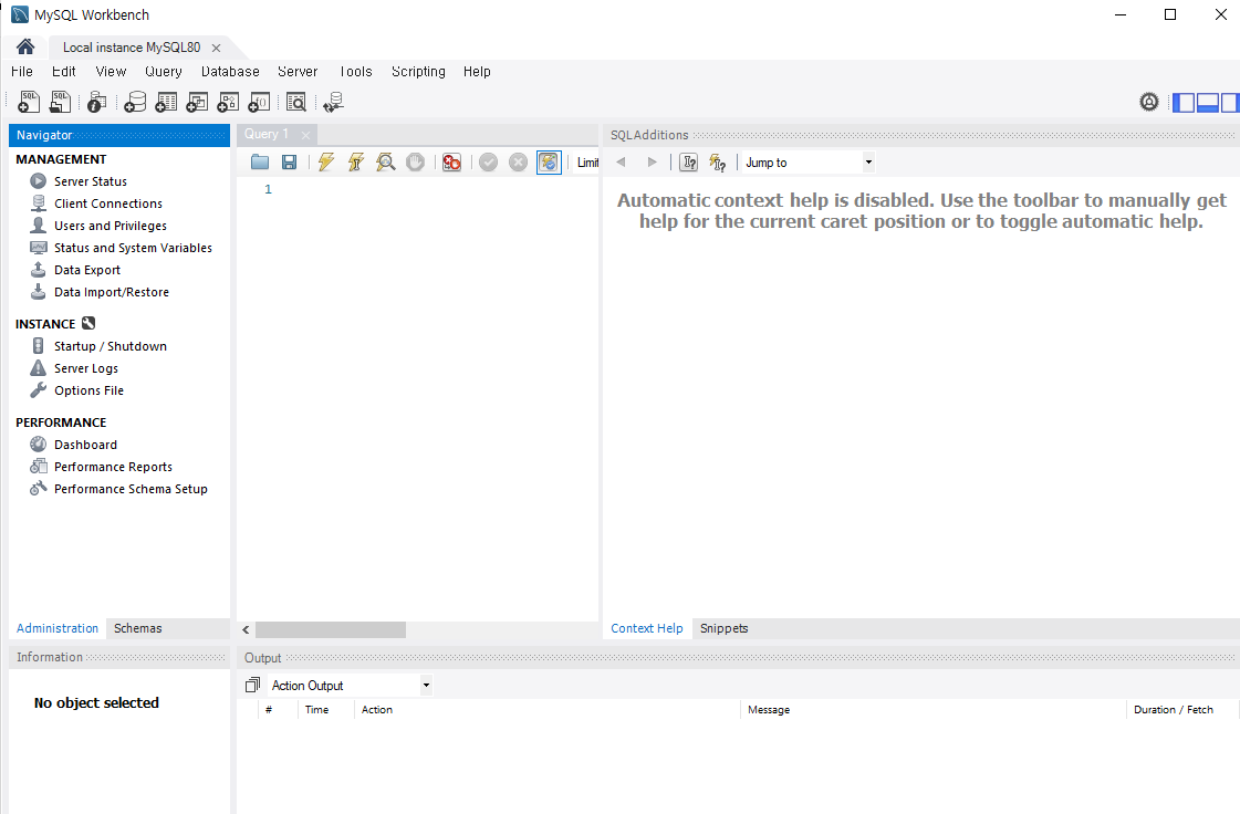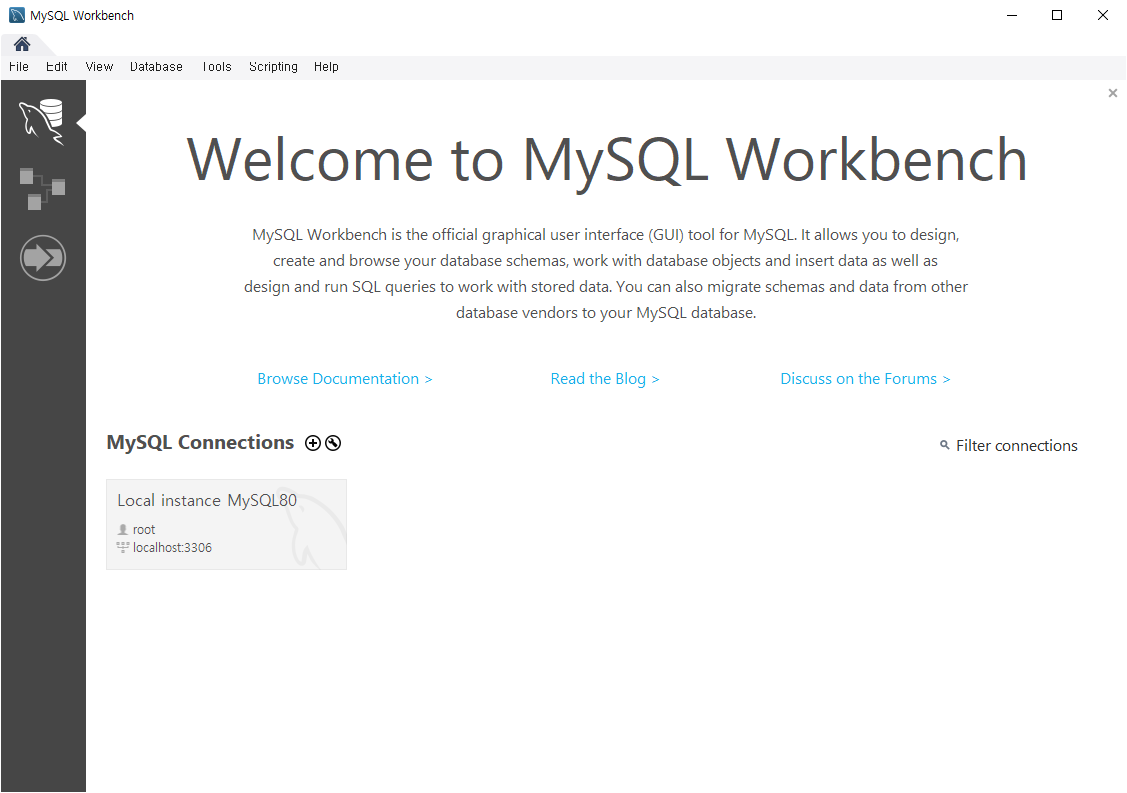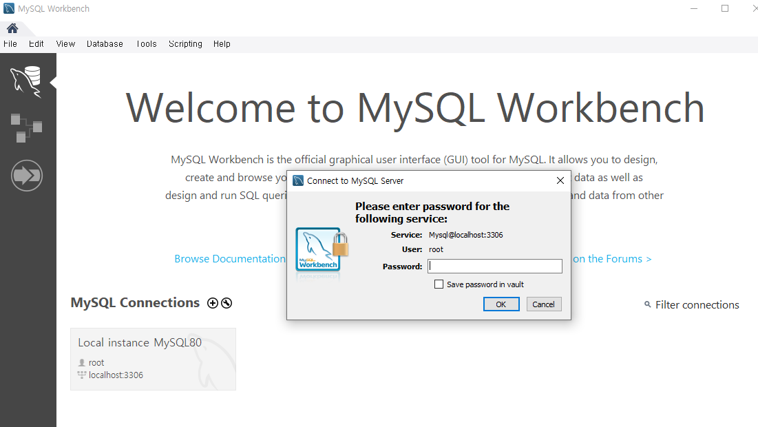 MySQL Workbench를 실행하여 패스워드를 입력합니다.