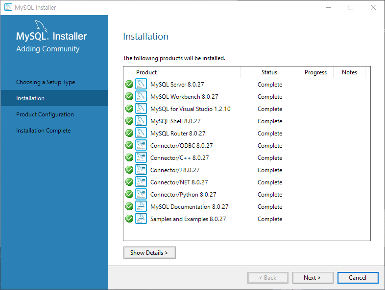 mysql setup2 설치가 완료된 항목들이 나옵니다.