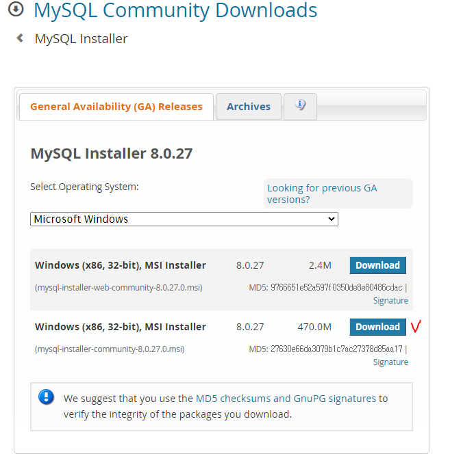 Select Operating System: Select Operating System… Microsoft Windows Select OS Version: All Windows (x86, 32-bit) Windows (x86, 32-bit), MSI Installer 8.0.27 2.4M (mysql-installer-web-community-8.0.27.0.msi) MD5: 9766651e52a597f0350de8e80486cdac | Signatu