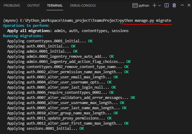 (3) migrate 를 사용해서 프로젝트의 변동 사항을 데이터 베이스에 적용합니다.