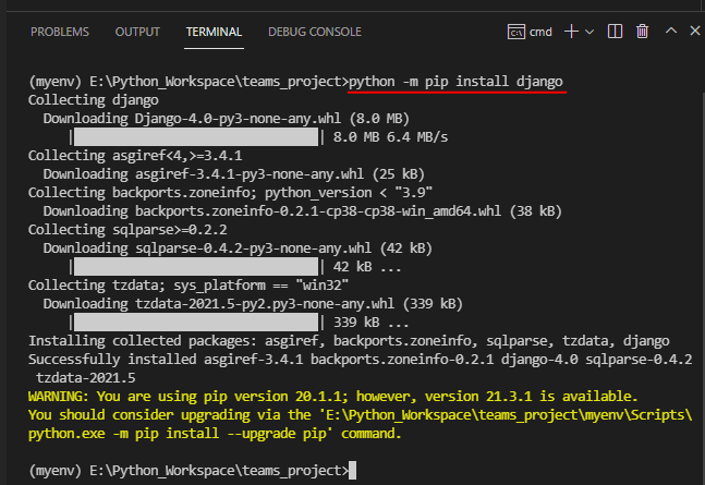 Terminal 에 "python -m pip install django" 명령어를 입력합니다.