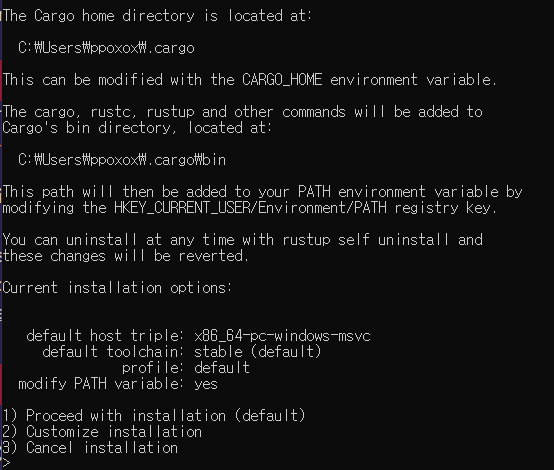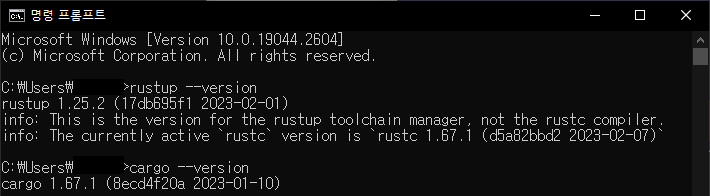 cmd를 다시 실행한 뒤 설치가 잘되었는지 확인하기 위해 rustup, cargo 버전을 확인합니다.