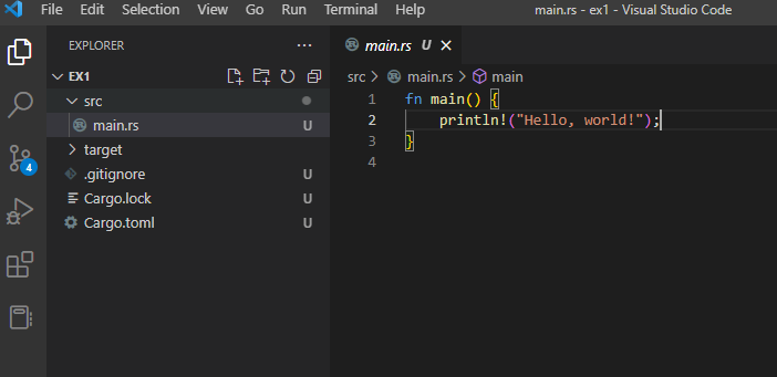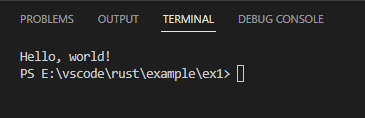 cargo new Ex1PS C:\Users\ppoxox> cd e: PS E:\vscode\rust> cd example PS E:\vscode\rust\example> cargo new ex1 Created binary (application) `ex1` package PS E:\vscode\rust\example> cd ex1 PS E:\vscode\rust\example\ex1> ls 디렉터리: E:\vscode\rust\example\ex1 Mode LastWriteTime Length Name ---- ------------- ------ ---- d----- 2023-02-21 오후 5:05 src -a---- 2023-02-21 오후 5:05 8 .gitignore -a---- 2023-02-21 오후 5:05 172 Cargo.tomlcargo에 의해 자동으로 생성되는 프로젝트 구성을 확인할 수 있습니다.
