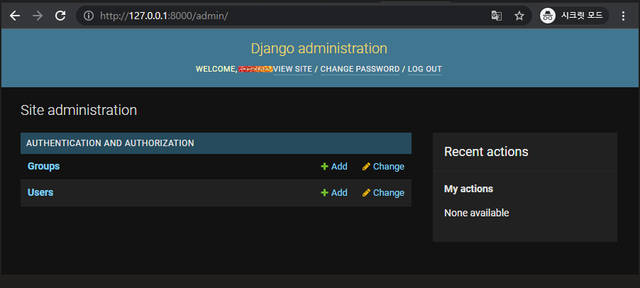 http://127.0.0.1:8000/admin 을 url에 입력하면 admin login 창이 나옵니다.