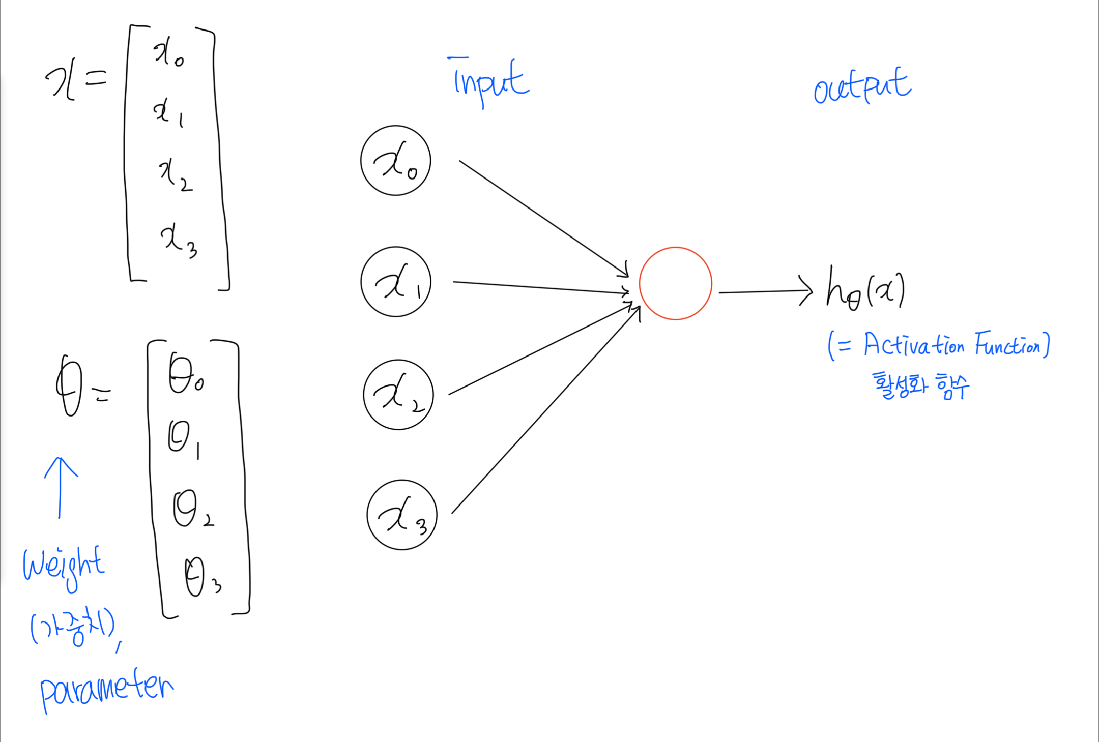 여러개의 뉴런으로부터 입력 값을 받아서 세포체(cell body)에 저장하다가 자신의 용량을 넘어서면 외부로 출력 값을 내보내는 것처럼, 인공신경망 뉴런은 여러 입력값을 받아서 일정 수준을 넘어서면 활성화되어 출력값을 내보냅니다.