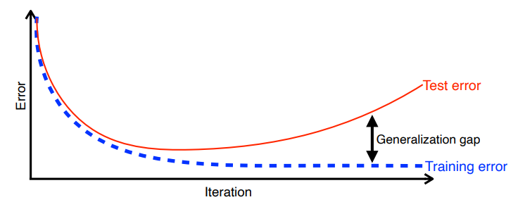 학습 iteration이 지나갈 때 마다 학습 데이터의 train error는 줄어듭니다. 하지만 train error가 0이 되었다고 해도 우리가 원하는 최적 값에 도달했다는 보장은 없습니다.