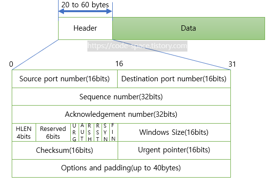 - 출발지 포트 정보 2bytes - 도착치 포트 정보 2bytes - 시퀀스넘버 4bytes - Acknowledgement(응답) 넘버 4bytes - 플래그 2bytes - Tcp header(4bit), reserved(6bit), control flags(6bit) - 윈도우 사이즈 2bytes - 체크섬 2bytes - urgent pointer 2bytes헤더의 최소 크기 : 20byte