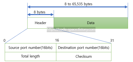 - 출발지 포트 정보 2bytes - 도착치 포트 정보 2bytes - 전체 헤더의 크기(헤더 + 데이터) 2bytes - 체크섬 2bytes참고
