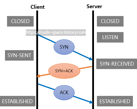 TCP/IP프로토콜을 이용해서 통신을 하는 응용프로그램이 데이터를 전송하기 전에 먼저 정확한 전송을 보장하기 위해 상대방 컴퓨터와 사전에 세션을 수립하는 과정입니다.