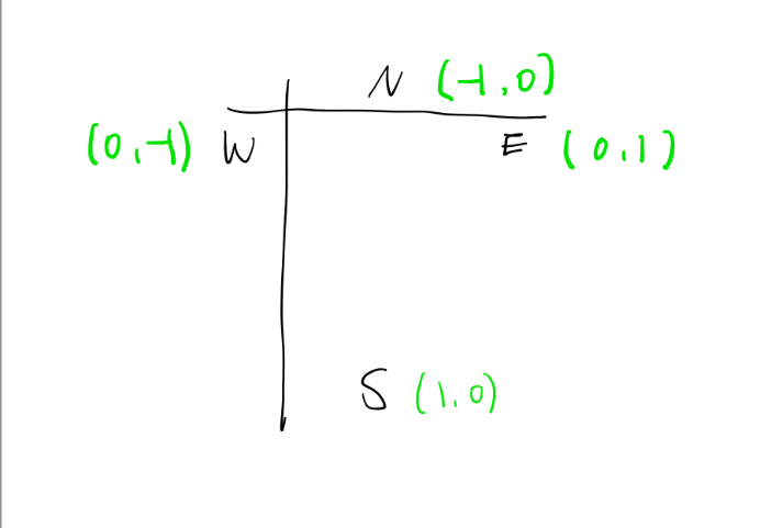 경로가 항상 값이 증가되는 형태로 이동되지 않고 W, N 방향은 값이 감소되어하기 때문에 while문을 통해 방향에 따른 값을 변경시키는 함수를 만들었습니다.