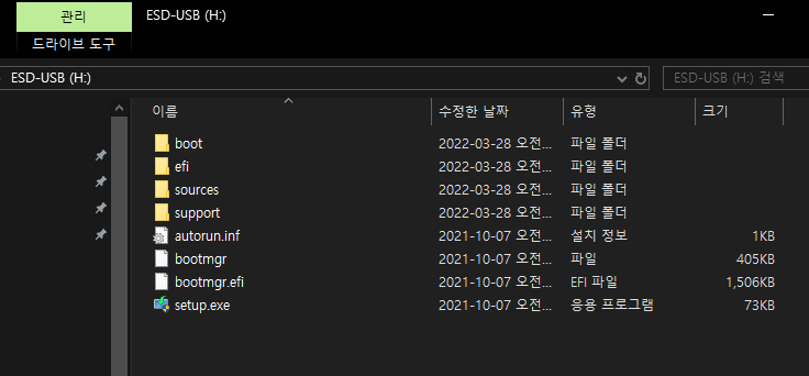 USB 이름도 바뀌고 안에 windows10 설치 파일을 확인할수 있습니다~