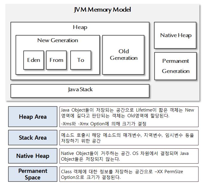 - Java Heap Memory영역 중 Permanent영역은 String pool, Class Method와 관련된 각종 Meta Data등을 저장하는 용도로 사용된다.