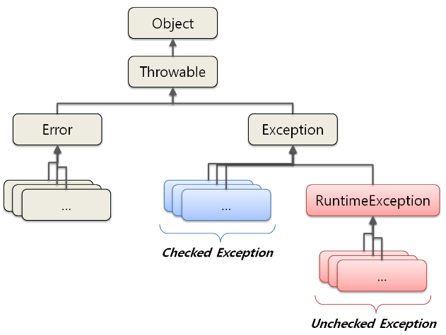 사진 출처 : https://www.nextree.co.kr/p3239/ 자바 실행 시 발생할 수 있는 프로그램 오류를 Error와 Exception두가지로 구분한다.