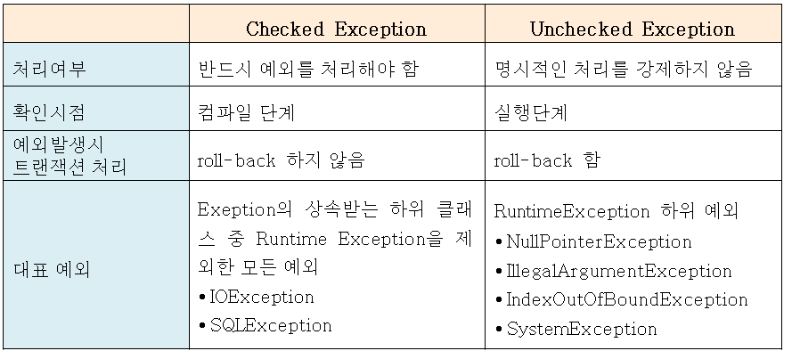 https://www.nextree.co.kr/p3239/ 컴파일러가 에러처리를 확인하지 않는 RuntimeException클래스들은 unchecked 예외라고 하고,