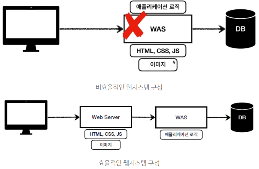 만약 WAS가 정적 콘텐츠 요청까지 처리하게 되면, 부하가 커지고 동적 콘텐츠 처리가 지연되면서 수행 속도가 느려지고 이에 따라 페이지 노출 시간이 늘어나는 문제가 발생하여 효율성이 크게 떨어지게 된다.