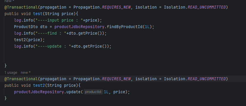 product테이블의 price를 조회, 변경하는 중에 데이터에 접근하면 어떤 데이터가 나오는지 테스트해보자.