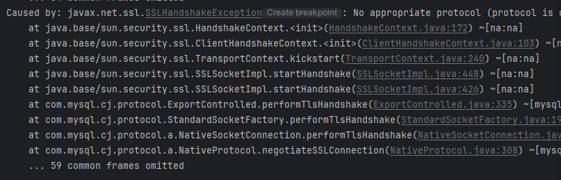 그래서 TLSv1.2를 지원하지 않는 예전의 MySQL5.7버전 이하를 사용할 겨우 SSLHandshakeException이 발생하게 된다.