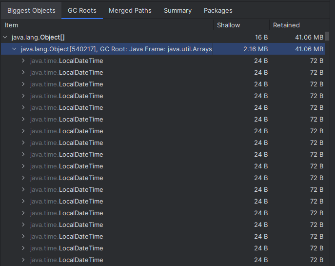 LocalDateTime객체가 540276번 사용되고, 힙 메모리의 50MB중 38.9MB를 사용한 것을 확인할 수 있습니다.