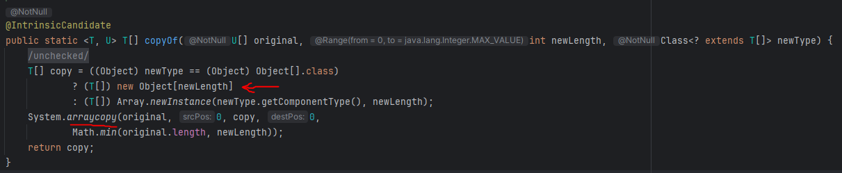 ArrayList의 용량을 증가시키고 copyOf()메소드로 기존 데이터를 복사해 새로운 객체를 할당합니다 -> Array.newInstance()